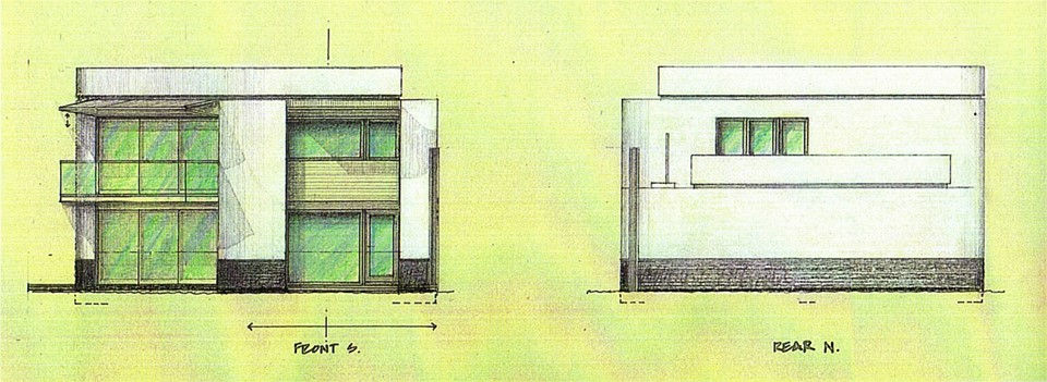 Elevation drawing, using watercolour pencils to give an indication of colour.